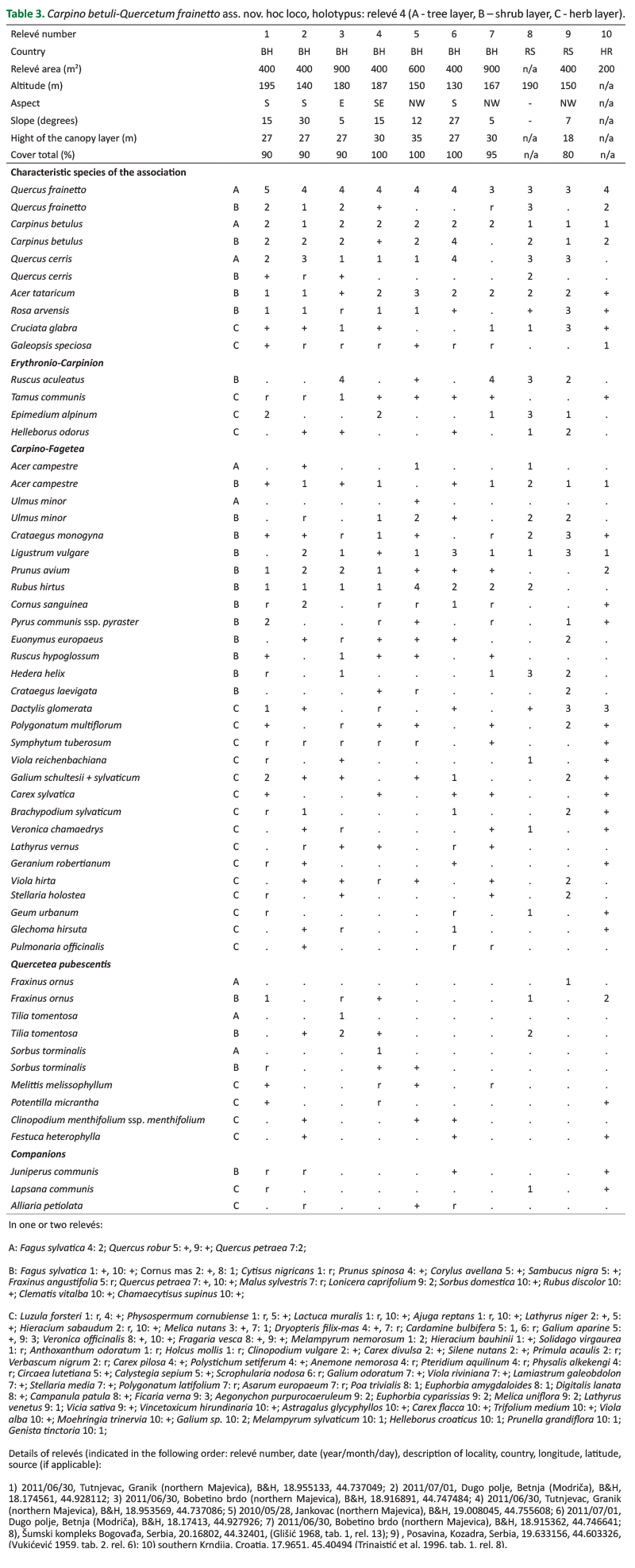 The published relevés of this association were originally mainly assigned to Quercetum frainetto-cerridis (Rudski 1949) Trinajstić et al. 1996 carpinetosum betuli Rudski 1949 (Vukićević 1959, Glišić 1968, Trinajstić et al. 1996, Stajić et al. 2008) and Quercetum frainetto-cerridis ruscetosum aculeati Jovanović et Dunjić 1951 (Jovanović and Dunjić 1951, Vukićević 1959, Glišić 1968) or were not assigned to any subassociation of Quercetum frainetto-cerridis (Fukarek et al. 1974).
