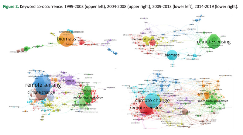 VOSviewer calculated and created the keywords’ co-occurrence from bibliographic data with a minimum threshold of 2 occurrences of the keywords. One can say that the network structure consists of 7 clusters where each cluster is made of distinct keywords. The links between nodes indicate the strength of co-occurrence of words between clusters. As it can be seen in Figure 2, biomass with the highest centrality is located in the centre of the graph, followed by pyrolysis and supercritical fluid extraction in the upper left side of the network. Within the second sub-period (2004-2008), the total number of keywords increased to 477, with a minimum of 2 occurrences of each keyword, making 25 clusters. In this period, remote sensing and mechanical properties are centralized, and logging, accumulation, hidden Markov models are periphery. Parallel to growth in publications during the 2009-2013 sub-period, the total number of keywords has increased to 1243 with the same criteria mentioned for the previous periods. Although remote sensing still stands with the highest centrality located in the centre of the network of the graph, biodiversity, climate change, and recycling started to appear within the network structure. Finally, climate change has become the latest research topic in the last sub-sequence.