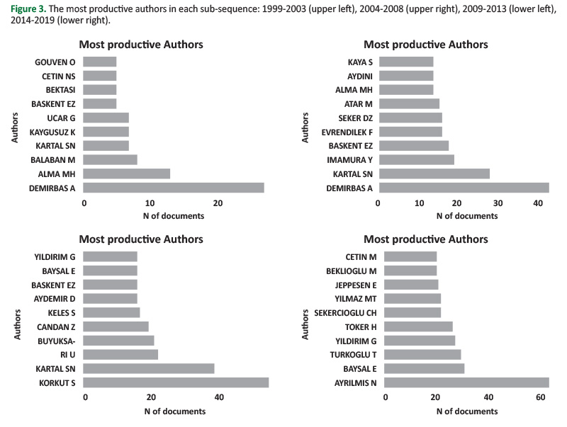 For instance, the total average citation decreased from 33.73 in 1999-2003 to 28.68, 20.91, and 9.31 in other three periods respectively. Although the total number of articles has grown steadily from 371 in the first period (1999-2003) to 4020 in the last period (2014-2019), the annual percentage growth rate for each period fluctuates between 19.93% and 19.30%, and 3.07% and 12.82%, respectively (Table 1). These results confirm that the increasing number of research institutions in Turkey in the last three decades have triggered the number of researchers and the number of articles.
