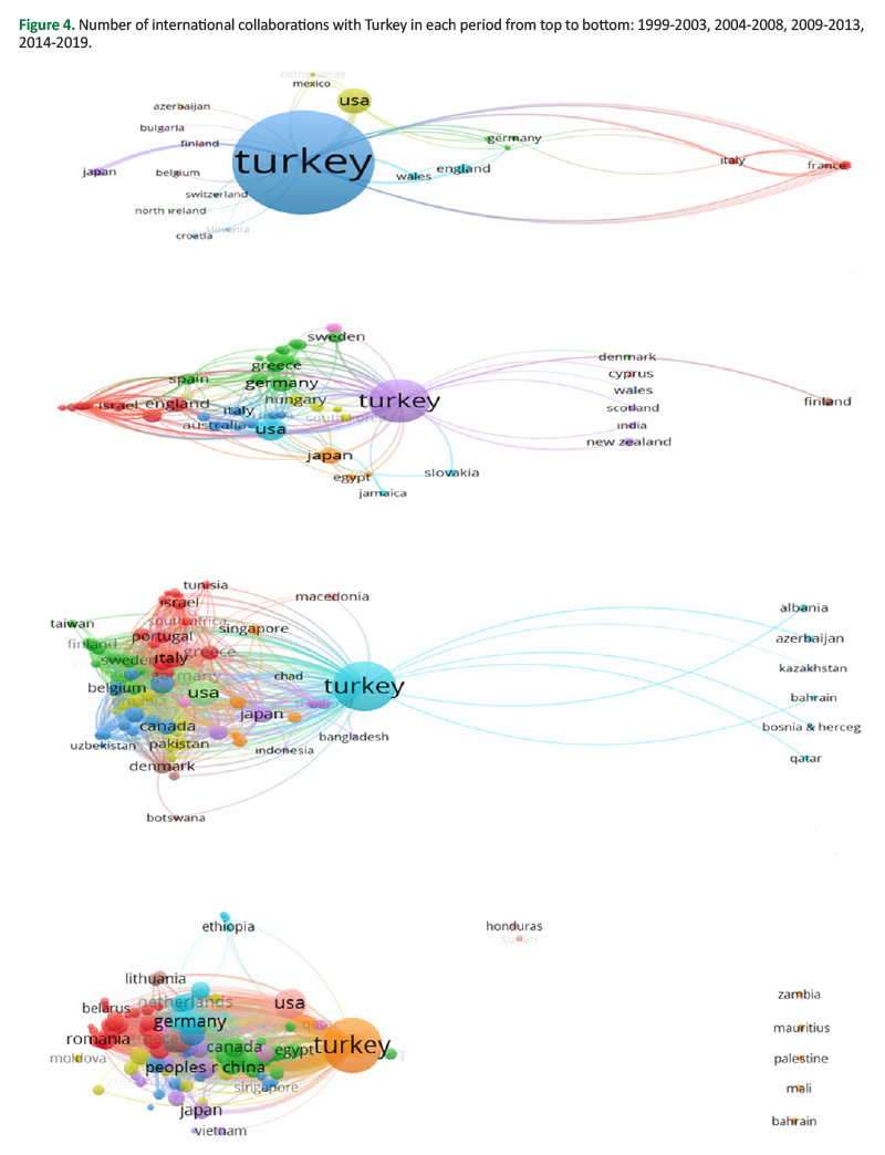 Properties of the network structure of scholarly forestry papers authored by Turkish scientists between 1999 and 2019 indicate that the degree of collaboration at the international levels gradually increased in each period (Figure 4). The number of nodes in the network has increased steadily in the second and third period (1999-2003, 2004-2008), yet the network is not well connected. The centrality coefficients of the network structure revealed that sub-clusters within the social network structure are more connected at the micro-level than that at the macro level. The betweenness coefficients’ centrality remained low in each sub-period, whereas the closeness centrality increased in each period. The closeness centrality stayed above almost 50% in all sub-periods, which is an indication of the small-world phenomenon in the network structure. There was a 90% increase in the number of publications compared to the third period (2009-2013). The increasing number of publications in the fourth sub-period (2014-2019) shows the concrete repercussions of the academic incentive application implemented in 2016 by Higher Education Council (YÖK) and changes in academic upgrade criteria made by the Inter-University Council (UAK).