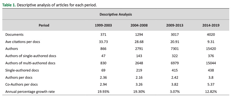 A total of 8702 articles were extracted from WoS from 1999 to 2019. Description analysis is shown in Table 1. The number of records, average citation per article, the total number of authors, authors of single-authored articles, authors of multi-authored articles, authors per item, and co-authors per reports have increased for each sub-period, except for average citations per document and annual percentage growth rate.