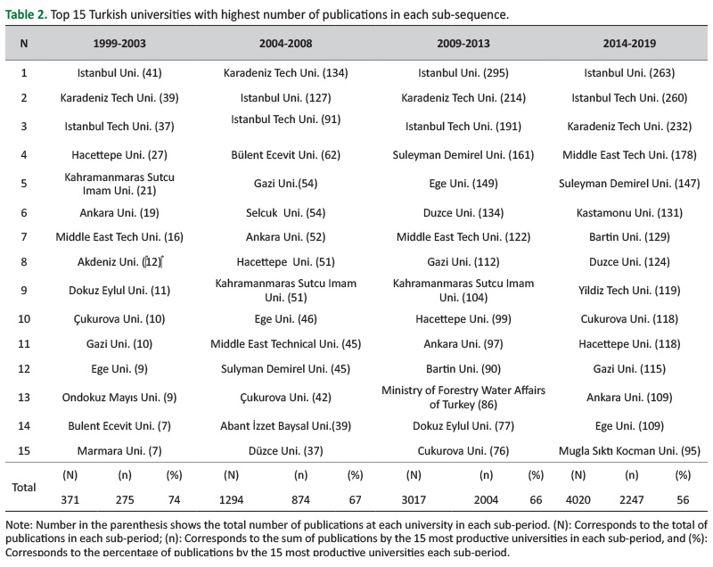Table 2. Top 15 Turkish universities with highest number of publications in each sub-sequence.