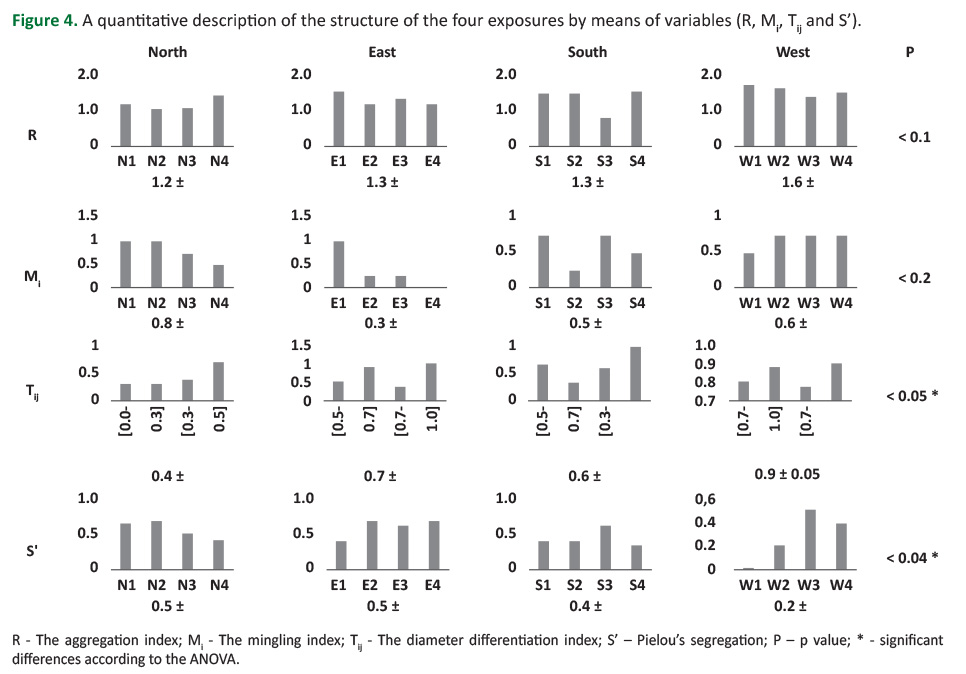 The diameter differentiation index (Tij) was calculated for all trees. For the overall plot’s value it was derived as an average index of individual trees on the plot. When the 4 nearest neighbours were observed, the results showed that the diameter differentiation in the western and eastern exposures was almost the same as a very large differentiation index, 0.9±0.1 and 0.7±0.3, respectively, which in fact presented a very large differentiation (0.7<TI<1.0) because the tree with the smallest DBH is 30% thinner than that of the reference tree’s size. The (Tij) index indicates a large differentiation level in the south-facing plots with 0.6±0.2. The index value was same as the average index only in the northern exposure (0.4±0.1)