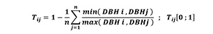 where Tij represents DBH differentiation index; DBH = diameter at breast height (in cm) thereby, i stands for a reference tree, j refers to the closest neighbour trees. Therefore, the DBH differentiation index was computed by using four closest neighbour trees around each reference tree (Pommerening 2002).
