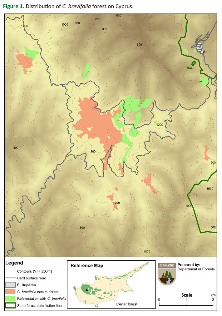 Cedrus brevifolia is a wind-pollinated conifer tree species of the Pinaceae family (Meikle 1977). It is an endemic species of the Cyprus flora, with narrow distribution, since it occurs in a sole population in the area of Paphos Forest. Cedrus brevifolia forest covers an area of 290 ha, which constitutes less than 0.2% of the high forest vegetation in Cyprus. From 1960 the Department of Forests has been implementing mass plantation of C. brevifolia plants at the boundaries of the natural forest of the species, covering today an area of ~130 ha (Eliades et al. 2019).
