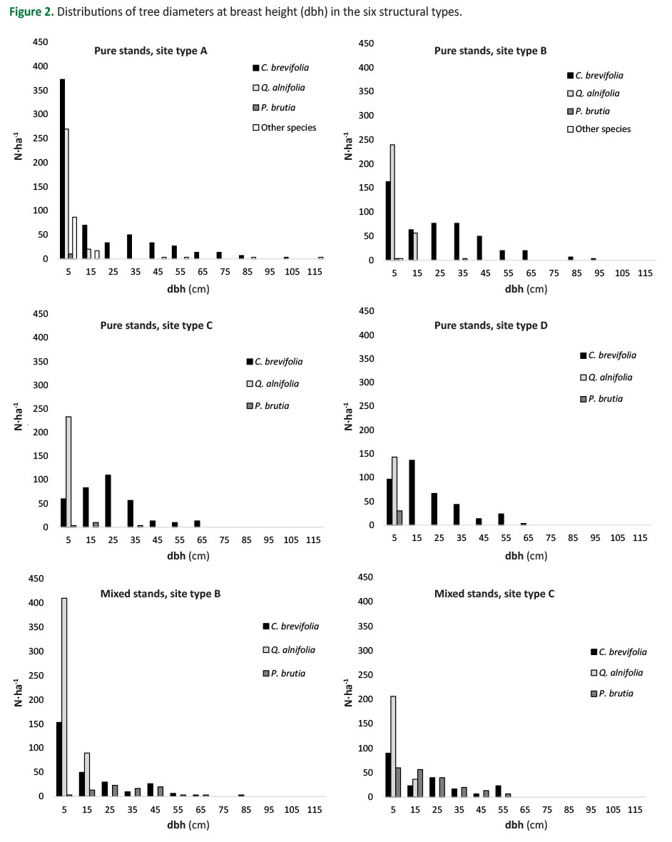 In C. brevifolia forest, the diameter distributions of all structural types indicate uneven aged stands (O’Hara 2014) where the individuals with great dimensions are possibly the survivors of previous disturbances, especially in the moderately productive sites (SC) and poorly productive sites (SD) (Milios et al. 2007). On the other hand, in more productive sites (SA and SB) the great dimension of many of the large trees might have been the result of the more intense competition in combination with the favorable site conditions (Oliver and Larson 1996).