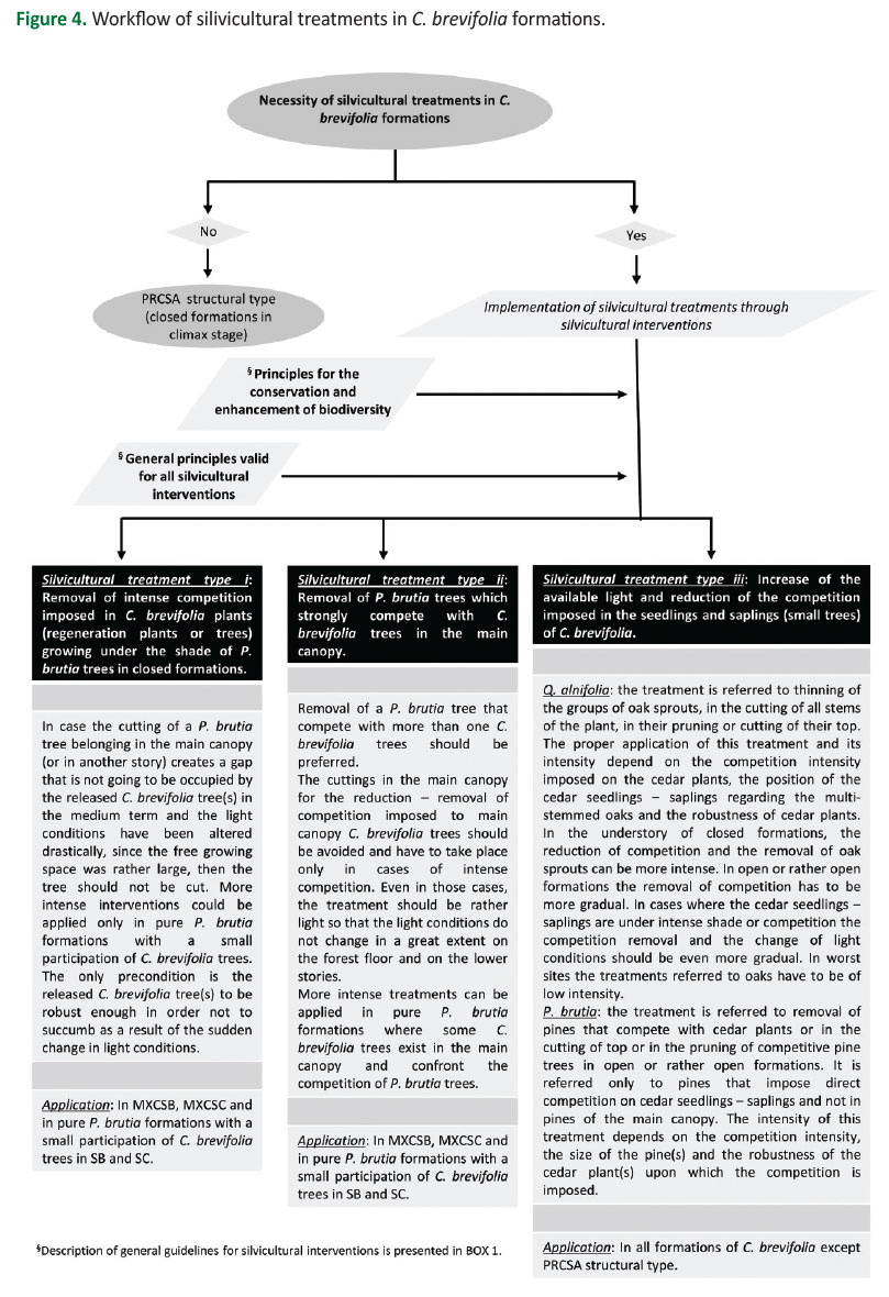 Based on the emerged knowledge from this study a workflow was developed, with specific silvicultural treatments for C. brevifolia formations. A detailed description of each of the three silvicultural treatment types that have been developed for C. brevifolia formations is presented in Figure 4, which also presents the structural types of C. brevifolia formations where each silvicultural treatment should be applied.