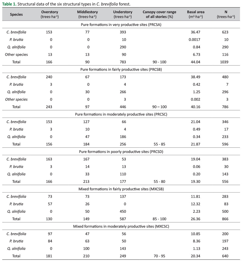 The basal area of C. brevifolia in pure formations ranges from 19.04 m2·ha-1 in poorly productive sites (PRCSD) to 38.49 m2·ha-1 in fairly productive sites. The maximum canopy cover of C. brevifolia formations is 100% in very productive (PRCSA) and in fairly productive sites (PRCSB, MXCSB), while in moderately productive sites it is 85% in PRCSC, and 95% in MXCS. In poorly productive sites (PRCSD) it is 80% (Table 1).