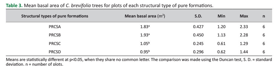 In the comparisons among the heights of the tallest C. brevifolia trees of the pure formation structural types (for each structural type the heights of the five tallest trees of each plot were used) the Dunnett T3 was used, since there was no homogeneity of variances. In the comparisons among the basal areas of the pure formations of C. brevifolia found in the different site productivity areas, the Duncan test was used.