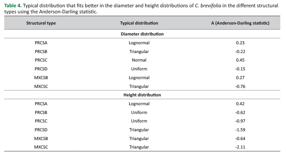 The lognormal distribution fits better in the diameter distributions of C. brevifolia in PRCSA and in MXCSB structural types, while the triangular distribution fits better in the diameter distributions of the species in PRCSB and in MXCSC structural types. In the diameter distributions of C. brevifolia in PRCSC and in PRCSD the distributions that fit better are the normal and the uniform respectively (Table 4). In the height distributions of the species, the triangular distribution fits better in PRCSD, MXCSB and in MXCSC structural types. In PRCSB and PRCSC the distribution that fits better is the uniform one, while in PRCSA, lognormal distribution fits better (Table 4).
