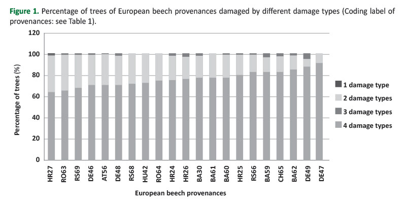 The aim of the study was to provide insight into the differences in hypersensitivity to pests and diseases between provenances of international European beech provenance trial, considering local climatic conditions. It investigated: I) damage types, II) crown damage intensity, III) damage frequency, and IV) clustering of provenances based on damage types.