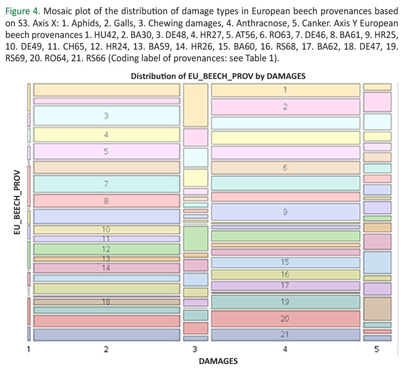 Frequency analyses of damage types are shown in frequency table (S3) and the mosaic map (Figure 4). According to damage frequency, anthracnose was the most common damage (42.62%), followed by galls (41.72%), canker (7.88%), chewing damages (7.02%), and aphids (0.76%). Anthracnose, galls and canker were found in each provenance. Provenances DE47 (0.09%) and BA30 (3.23%) were the least, HR25 (3.23%) the most anthracnose-damaged provenances. The provenances that were the least and the most damaged by galls were BA62 (0.33%) and DE48 (3.75%), respectively. The lowest and the highest canker damages were observed on DE49 (0.09%) and DE47 (0.85%), respectively. Chewing damages were detected in the range of 0.05% (DE49) to 1.38% (HU42) in most provenances, except for DE47 and CH65. Aphids were detected in the range from 0.05% to 0.14% in 11 provenances: AT56, BA30, HR26, DE48, DE49, CH65, RS66, HU42, HR24, RO64, and BA61. In the absence of aphid damage, the statistical chi-square test for damage to European beech provenances showed that there were significant statistical differences between provenances based on damage types (sample size=2091, χ2=322.19; p<0.0001). Thus, the dominant types of damage, anthracnose and galls, showed a total frequency of 84.34%, while canker, chewing damages, and aphids showed a total frequency of 15.66%.