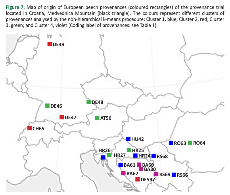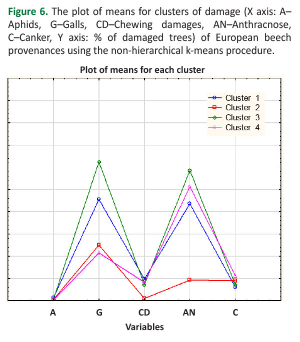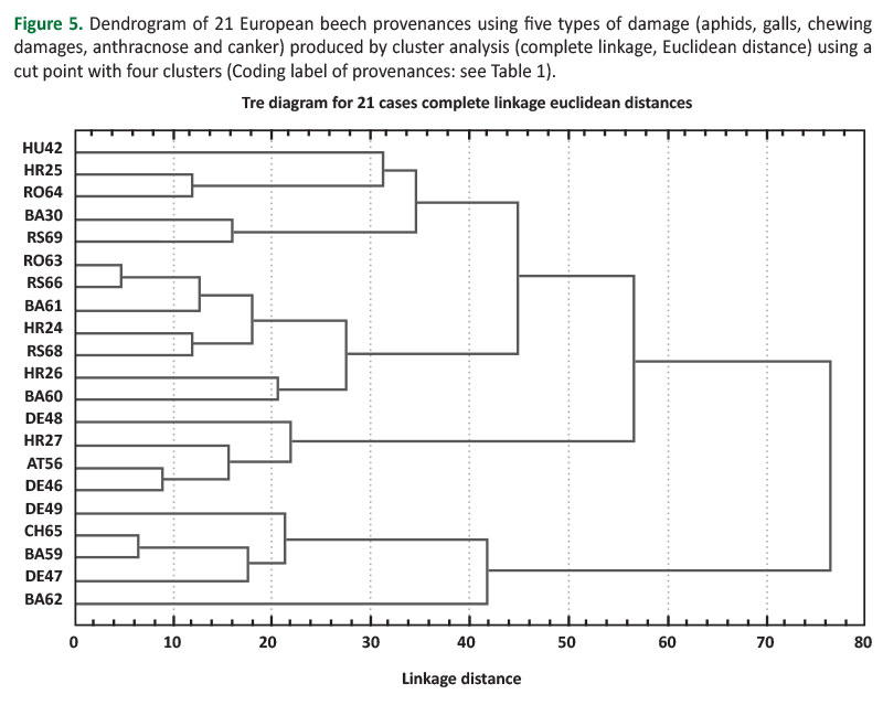 Clustering analysis allowed the grouping of provenances into four clusters, showing no grouping of Central and Southeast European provenances into separate clusters. Cluster 2 consisted of three Central European provenances (DE49, DE47 and CH5) and Southeast Europa provenance BA59, while Cluster 3 consisted of three Central European provenances (DE46, DE48 and AT56) and Southeast European provenances (HR25, HR27 and RO64). Cluster 4 was composed of Southeast European provenances, mostly from Bosnia and Herzegovina (BA62, BA60 and BA39), and including one provenance from Serbia (RS69). Central and Southeast European provenances, as well as the provenances of each country, could not be clearly separated according to damages by cluster analysis.