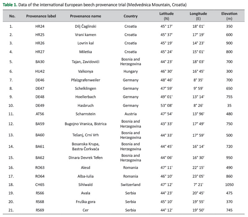 International European beech provenance trial is situated on Medvednica Mountain (45° 53'N, 15° 55'E, elevation 730 m, slope with west-northwest exposure). It consists of twenty-one natural populations (150 plants each) originating from Central Europe (DE, CH, AT, and HU) and Southeast Europe (HR, BA, SR, and RO) (Table 1). It was established by the Croatian Forest Research Institute in March 2007 (Ivanković et al. 2008a, 2008b, Bogunović et al. 2020).