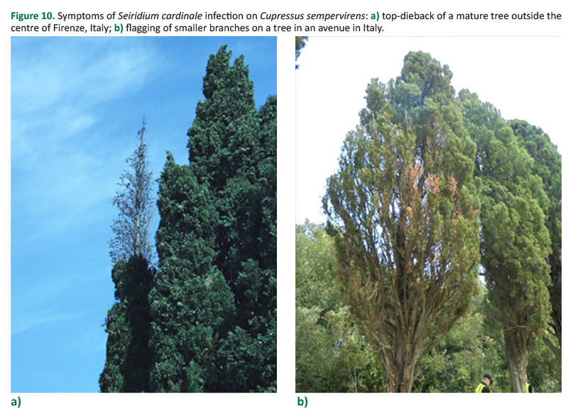 This disease problem was first recognised in Europe when an outbreak occurred in Italy in the 1930s (Graniti 1998). Once in southern Europe, however, Cupressus sempervirens L., an iconic tree species in Mediterranean landscapes proved highly susceptible to infection and damage from S. cardinale (Figure 10). In many regions now, the relatively non-susceptible species, Cupressus arizonica Greene is used as a replacement tree with similar environmental tolerance, although there is no obvious substitute for the fastigiate form of C. sempervirens (Beresford and Mulholland 1982, Saos et al 2001).