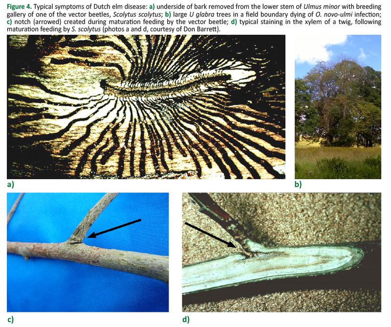 European and North America species of Ulmus are all highly susceptible to infection by O. novo-ulmi (Brasier 2000). The disease cycle is heavily reliant on the elm bark beetle vector, on which the spores of the pathogen adhere to the beetle exoskeleton (Webber 2000, Santini and Faccioli 2015). Elm bark beetles target trees in decline for egg laying (Webber and Brasier 1984). Following mating, the females bore a brood gallery into bark on declining elms, laying eggs at regular intervals along the gallery. When the eggs hatch, the larvae consume the nutritious secondary phloem of the inner bark tissues, with the pattern of galleries formed varying between Scolytus species (Figure 4a). Following pupation, the newly emerged beetles exit the dead bark tissues, but before mating must carry out maturation feeding, usually on bark in the upper parts of a healthy elm crown, often in branch crotches (Webber and Brasier 1984; Figure 4b). When emerging from the old bark tissues, the young beetles are in an environment that is perfect, in terms of temperature and humidity, for the pathogen to produce large numbers of coremia (fused conidiophores) covered in sticky masses of asexual spores. These spores adhere to the beetle exoskeleton and, when the beetles begin maturation feeding, the spores are introduced into the wounds formed, gaining entry to the host vascular tissues (Figure 4d). The tree is then infected: brown staining in the xylem tissues, typical of vascular wilt diseases, forms as the tree responds to the damage. Toxins produced by the fungus, however, cause severe disruption to the tree water balance, causing stomata to stay open and tyloses to form in the xylem vessels, even those that are not directly infected by O. novo-ulmi. The tree wilts and, eventually, dies. Bark beetles are attracted to the dying trees, lay their eggs in the bark tissues, and the disease cycle begins again (Webber and Brasier 1984).