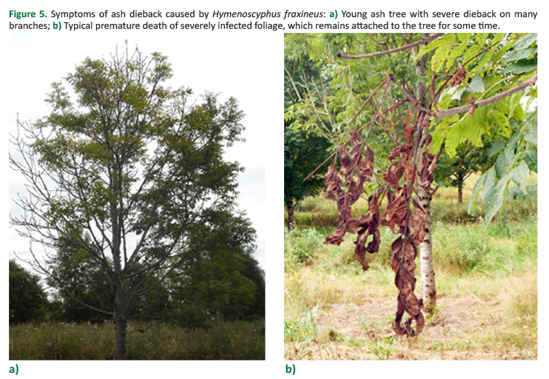 Figure 5. Symptoms of ash dieback caused by Hymenoscyphus fraxineus: a) Young ash tree with severe dieback on many branches; b) Typical premature death of severely infected foliage, which remains attached to the tree for some time.