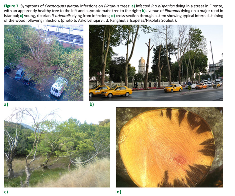 Figure 7. Symptoms of Ceratocystis platani infections on Platanus trees: a) infected P. x hispanica dying in a street in Firenze, with an apparently healthy tree to the left and a symptomatic tree to the right; b) avenue of Platanus dying on a major road in Istanbul; c) young, riparian P. orientalis dying from infections; d) cross-section through a stem showing typical internal staining of the wood following infection. (photo b: Asko Lehtijarvi; d: Panghiotis Tsopelas/Nikoleta Soulioti).
