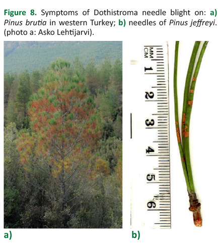 Figure 8. Symptoms of Dothistroma needle blight on: a) Pinus brutia in western Turkey; b) needles of Pinus jeffreyi. (photo a: Asko Lehtijarvi).