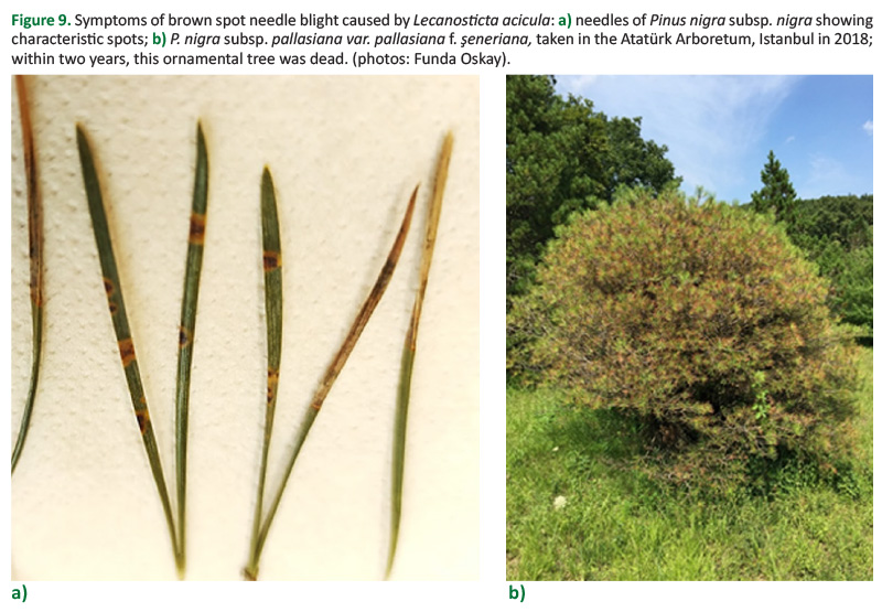 Figure 9. Symptoms of brown spot needle blight caused by Lecanosticta acicula: a) needles of Pinus nigra subsp. nigra showing characteristic spots; b) P. nigra subsp. pallasiana var. pallasiana f. şeneriana, taken in the Atatürk Arboretum, Istanbul in 2018; within two years, this ornamental tree was dead. (photos: Funda Oskay).
