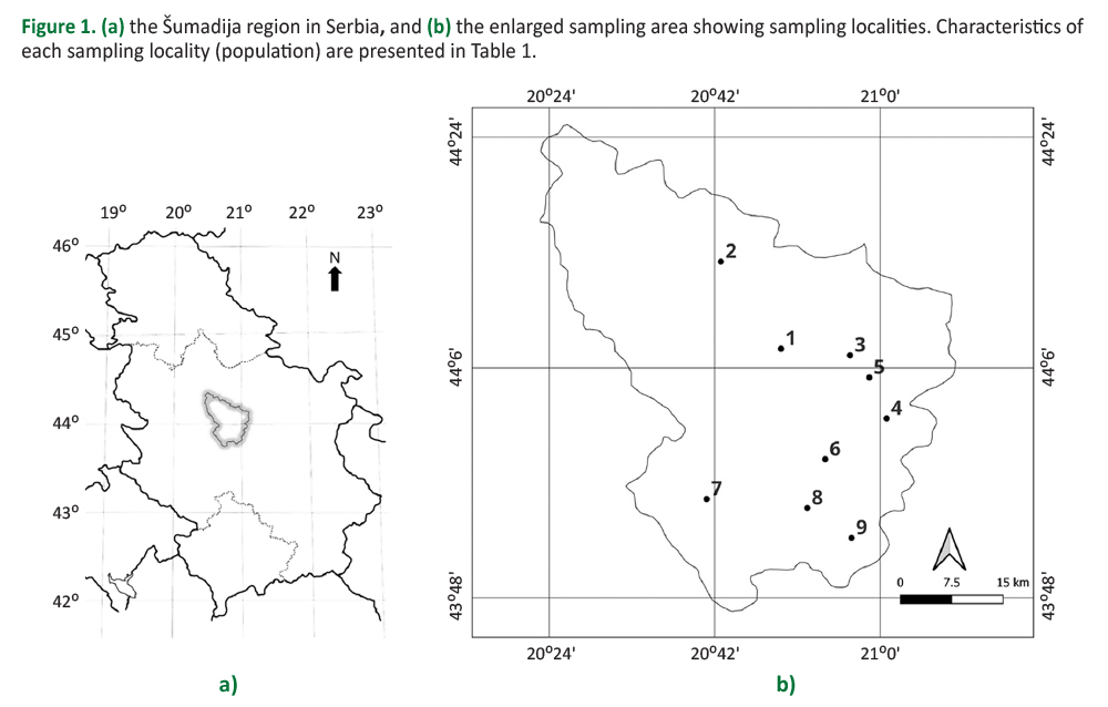 In the autumn of 2021, 138 randomly selected adult individuals of Q. cerris were sampled from nine natural populations in the central part of the Šumadija region in Serbia (Table 1, Figure 1). Šumadija, the central region of Serbia, occupies about 5800 km2, covering the area between the Sava and the Danube in the north, Great Morava in the east, West Morava in the south, and Kolubara in the west (Šikanja 2019). Q. cerris leaves were sampled within Hungarian oak and Turkey oak forests (Quercetum frainetto-cerris Rudski 1949). To minimize clone selection risk, all sampled individuals from the selected populations were located at least 5 m from each other (Li et al. 2021, Jovanović et al. 2022c). From each individual, 10 fully developed leaves were collected (1380 in total), at the height of 8 to 10 m around the crown of each tree (Viscosi 2015), mainly under shaded conditions. Leaves were herbarized and scanned by placing an abaxial surface facing upwards on an Epson Stylus DX4050 scanner, with a resolution of 300 dpi.