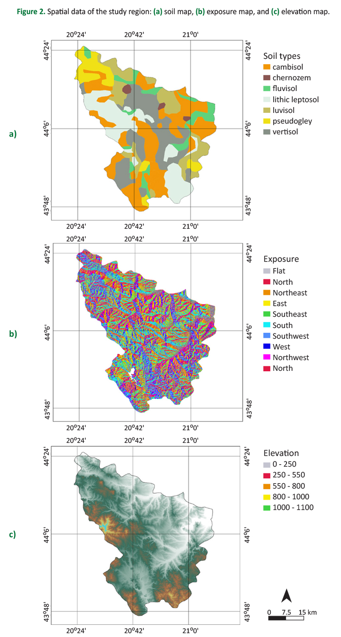 At each of the sampling sites, which were at least 10 km apart, latitude and longitude were recorded and used for obtaining information on soil types, exposure and elevation using QGIS 3.24.0 (QGIS Development Team 2022). The information on soil type was obtained from the imported digitalized maps using the data from Mrvić et al. (2013) and the Republic Geodetic Authority of Serbia (www.geoserbia.rs) which revealed three soil types at sampling sites – cambisol (eutric), vertisol, and lithic leptosol (Figure 2a). The information on the exposure and elevation (Figure 2b, c) was obtained by the SRTM Downloader Plugin in QGIS – Shuttle Radar Topography Mission (NASA Earth Data – https://urs.earthdata.nasa.gov/). This revealed six exposure groups – north, northeast, northwest, east, south and west, and nine elevation groups ranging from 288 to 444 m above sea level.