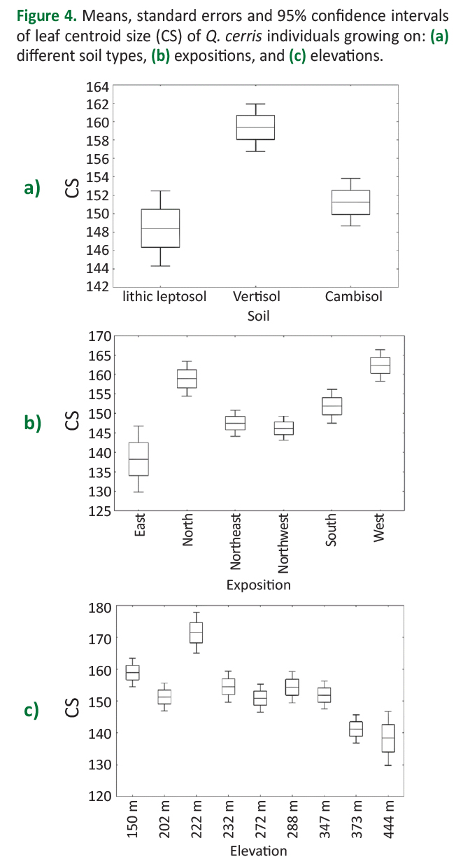 Procrustes ANOVA of leaf size and shape indicated that both size and shape show significant differences between individuals growing on different soil types, expositions and elevations (Table 2). Additionally, ANOVA of the centroid size indicated a statistically significant effect of soil type (F=23.11; P<0.01), exposition (F=12.74; P<0.01) and elevation (F=14.24; P<0.01) on leaf size (Figure 4). Individuals growing on lithic leptosol, on east exposition, and at higher elevations, had lower values of centroid size compared to individuals growing on cambisol and vertisol, north and west expositions and at lower altitudes, which had higher values of centroid size.