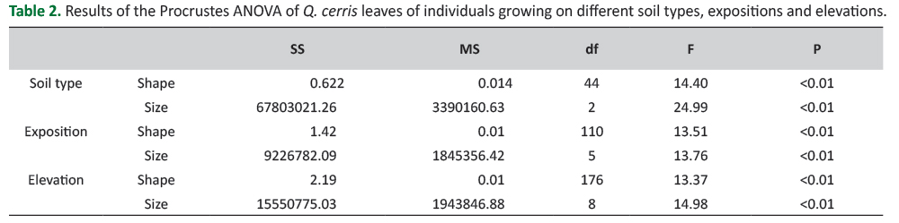 Procrustes ANOVA for leaf side of each individual (interaction individual × side) showed significant differences (F=3.25; P<0.01), indicating the presence of fluctuating asymmetry. The highest levels of fluctuating asymmetry were recorded in individuals growing on lithic leptosol, north-exposed sites and at lowest altitudes (Figure 8).