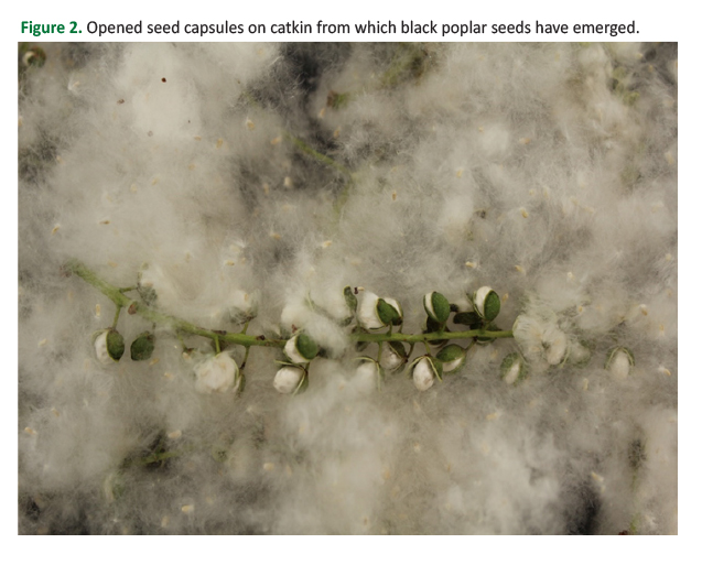 Figure 2. Opened seed capsules on catkin from which black poplar seeds have emerged.