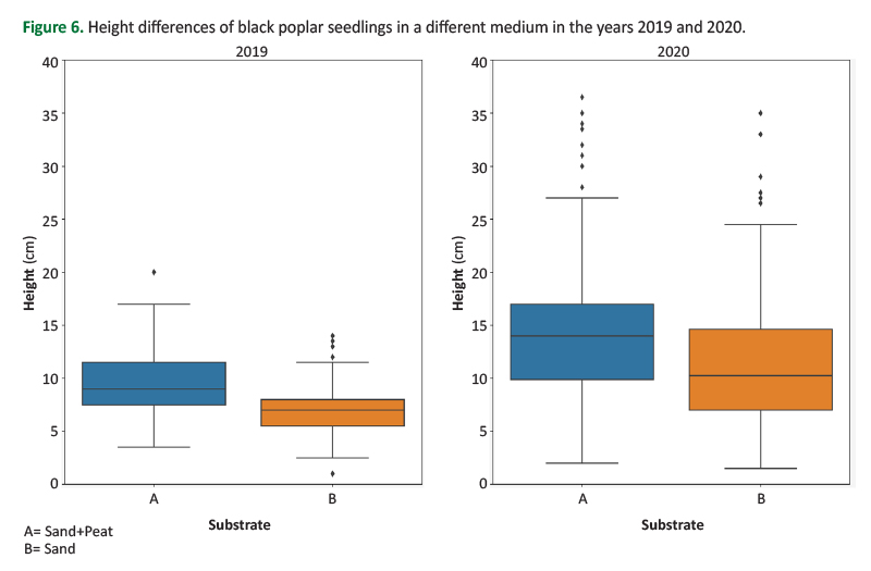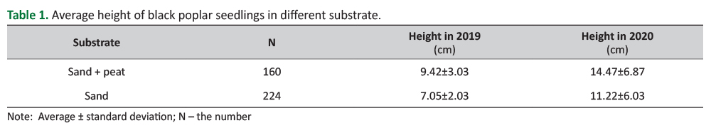 - Average height growth was significantly higher in European black poplar plants grown in sand + peat substrate, compared to plants grown in pure sand. This can be explained by the fact that neutral peat mixed with pure sand enables better plant growth, as it contains nutrients that young plants need for growth. On the other hand, pure sand is not so rich in nutrients, and frequent irrigation leads to faster washing away of the already modest amount of nutrients. Although pure sand proved to be a good initial substrate for seed germination, as it allows for longer retention of moisture and breathability, it turned out that soon after emergence the plants must be transplanted into a soil substrate with more nutrients.
