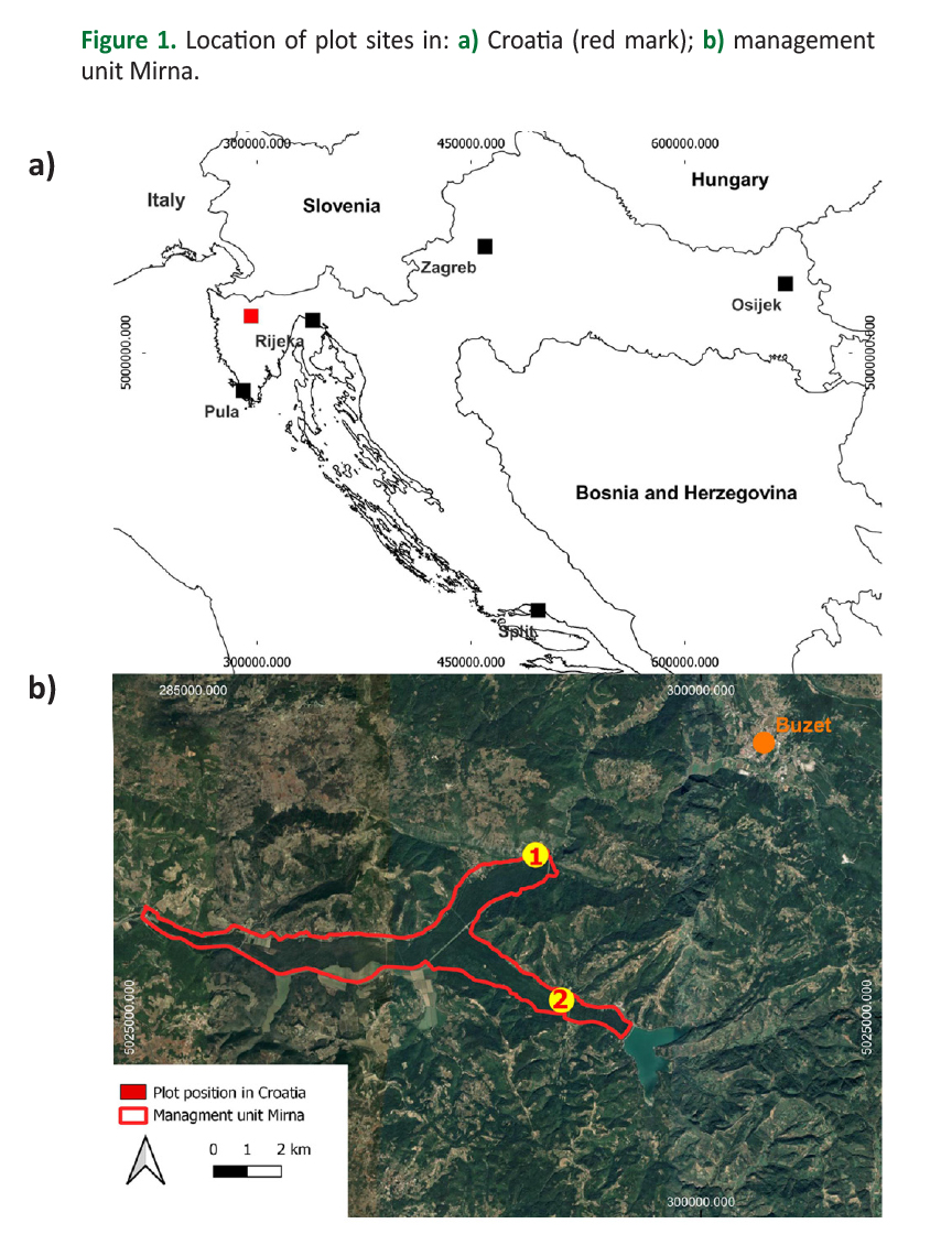 Figure 1. Location of plot sites in: a) Croatia (red mark); b) management unit Mirna.