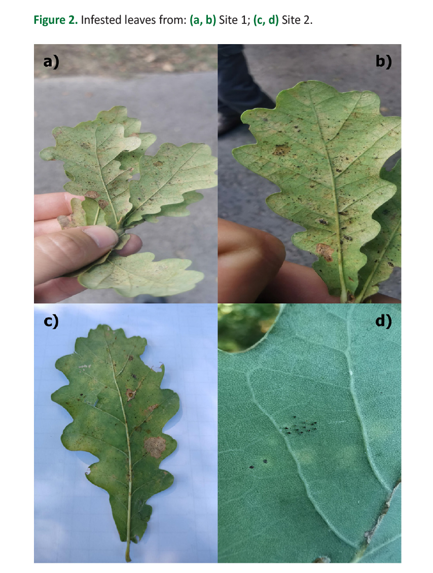 The sampling on Site 1 - Istria Thermal Resort resulted in the collection of leaves infested with OLB. On the leaves larvae and adults were present (Figure 2a, 2bb) and morphologically confirmed in the morphological laboratory analysis. All 15 sampled trees were infested with C. arcuata. On Site 2, out of 30 sampled oak trees, only one tree was infested with C. arcuata (HTRS96 Lat. 295950.221, Lon. 5025515.762). Egg masses and adults have been found on three (3) leaves on the northern part of the canopy (Figure 2c, 2d). On all other inspected trees on Site 2 egg masses, larvae or adults of OLB have not been found.