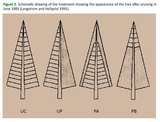 Previous studies revealed that pruning can also increase the proportion of heartwood. Langstrom and Hellqvist (1991) conducted 4 different pruning treatments on a 25-year-old pine stand in Jadraas, Central Sweden, namely: (1) unpruned control (UC); (2) unilateral pruning (UP), where all live branches were cut on one side of the crown; (3) pruning from below (PB), where all live circles were removed below the 1981, leaving the top four, and the expanding current circle was kept intact; and (4) pruning from above (PA), including all branches from 1984-1982 as well as the tops of others (segments 1985-1982 and its side branches) in the live circles below 1982, as shown in Figure 2. The result showed that UP reduced growth along the stem, while PB caused greater reductions in the lower stem. Furthermore, PA increased radial growth above and decreased development below the pruned crown fraction. The branch bottom area (needle biomass) of the developing new whorls was increased in the trees were pruned from above, and height growth was only slightly affected by the treatments. The treated groups had a total growth volume loss of 24-33% during the study period, compared to the controls. The pruning caused a decline in the conducting sapwood area as well as an increase in the non-conducting heartwood at breast level. The results also showed that the homeostatic adjustment was still incomplete after four growing seasons, except for the upper whorls, which developed after the process.