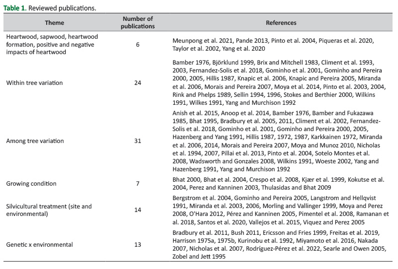 While conducting this review, we performed a semi-systematic or narrative review. We explored several databases such as Scopus, Science Citation Index, Science direct, Google Scholar, and ResearchGate, to identify and to download the abstracts, chapters, reports, books, proceedings, review articles and research papers related to the factors influencing variations in the heartwood proportion for solid wood. The search queries used during searching of information were: “heartwood variability”, “heartwood proportion”, “tree age of heartwood”, “growth rate of heartwood”, “silvicultural treatment of heartwood”, “genetic effect of heartwood”, and “environmental effect of heartwood”. The publication years were restricted from 1970 to 2022. Subsequently, a total of 159 documents (146 journals, 6 chapters, 4 reports, 2 books, and a proceeding) were found from the databases, but they were reduced to 67 journal articles, 4 chapters, 3 reports, a book, and a proceeding, based on the criteria of topic or title, objectiveness, and year of the publication. Both published and unpublished articles, such as journal articles, chapters, reports, books, and proceedings related to the heartwood formation and heartwood variation were grouped (Table 1). They were then analysed using qualitative analysis to identify, analyse and report patterns in the form of themes in a text.