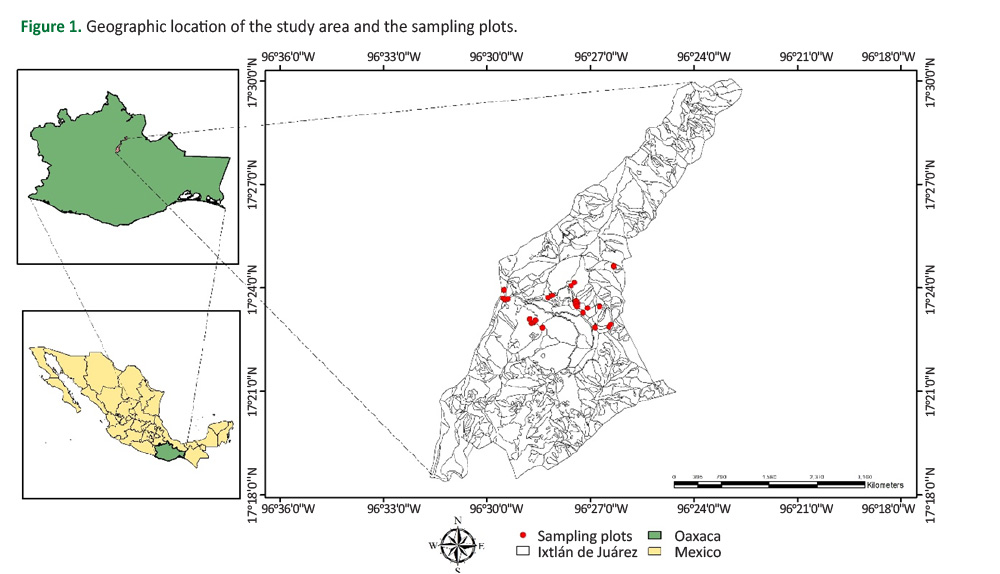 The study was conducted in the communal forests of Ixtlán de Juárez, Oaxaca, southern Mexico. This area is geographically located between the coordinates of 17°23'0.50''–17°23'0.58'' N and 96°28'45''–96°28'53'' W. The region falls within the physiographic province known as the Northern Oaxaca Mountain System (Figure 1). The predominant type of vegetation in this region corresponds to pine-oak forests, which were described as heterogeneous by Castellanos-Bolaños et al. (2010). The natural distribution area of Pinus ayacahuite, where the study took place, spans an altitudinal range of 2,600 m to 3,100 m and covers an area of 962.85 hectares. The predominant climates are temperate sub-humid with summer rains and temperate humid with summer rains (STF 2015).