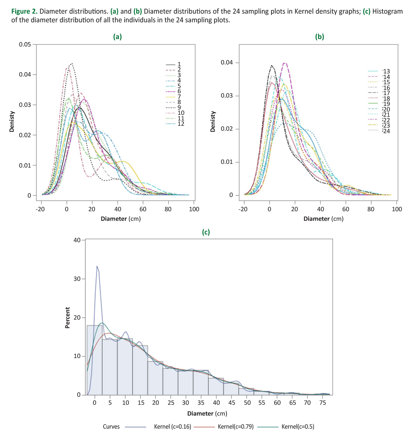 In the analysis, histograms and Kernel plots were created for distributions of diameters and heights per sampling unit and for the totality of the data. Pooled and unpooled data by diameter class were used. The statistical programs used were SAS® 9.4 (SAS Institute Inc. 2017) for histograms and Kernel of the grouped data (using the UNIVARIATE and KDE procedures) and RStudio® (R Core Team 2019) for Kernel graphs on non-grouped data (using the DENSITYPLOT function).
