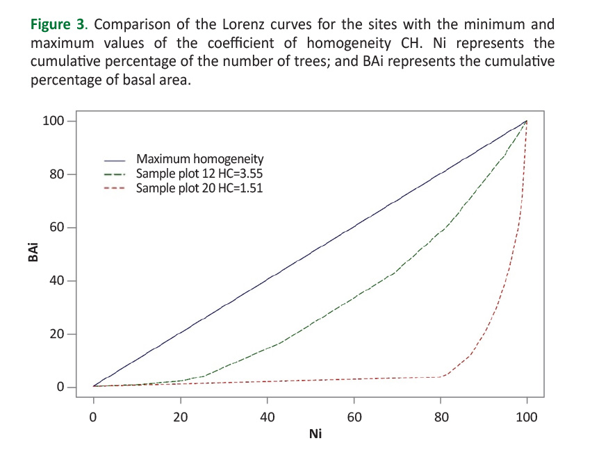 The horizontal characterization made with histograms and Kernel density graphs confirms the heterogeneity of the stands of Pinus ayacahuite. De Camino (1976) affirms that the coefficient of homogeneity CH varies between one and infinity, with a value of 1.0 indicating complete heterogeneity, and an increase represents an approach towards homogeneity. The CH values obtained fluctuated in the range of 1.51 to 3.55 and were represented with the Lorenz curve, which shows that, as the value of CH decreases, the curve moves further away from the line of maximum homogeneity (Figure 3) (De Camino 1976, Del Río et al. 2003).