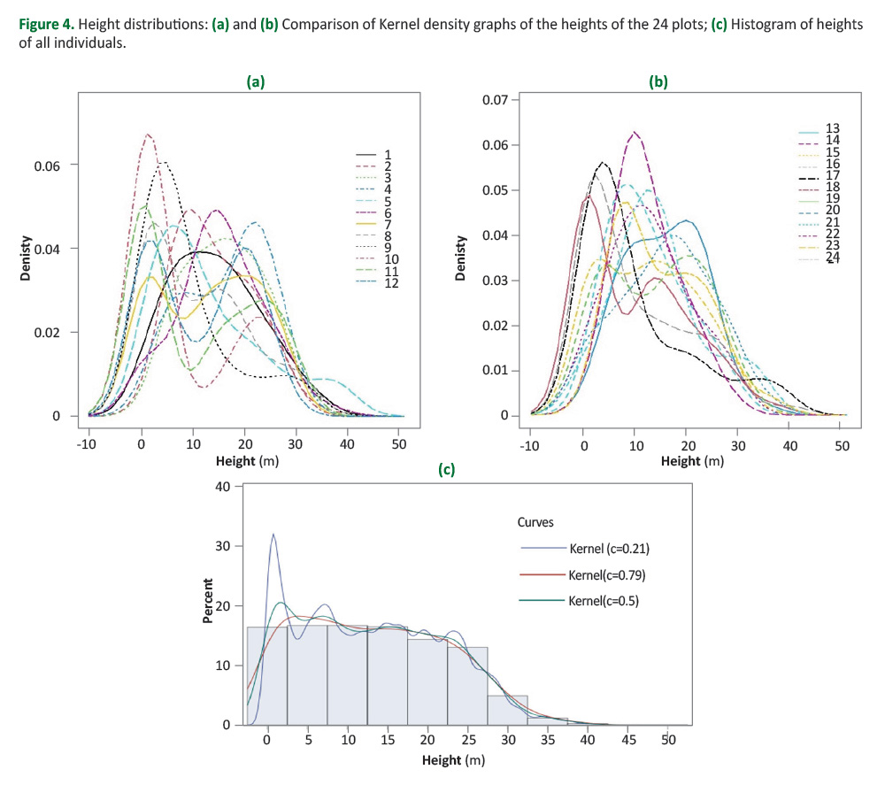 By plotting the heights of all 24 sample plots and comparing their distributions, we can easily discern the data grouping in the lower and middle strata. The presence of individuals taller than 30 m is rarer (Figure 4) because the upper stratum was not predominant in any plot. The number of modes and the asymmetry in the graphs help to identify the strata and allow us to infer whether the stands are in a juvenile or mature state (Gadow et al. 2007).