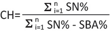 where CH is the coefficient of homogeneity; n is the number of diameter classes; SN% is the sum of the percentages of the number of trees up to diameter class i; and SBA% is the sum of the percentages of the basal area up to diameter class i.