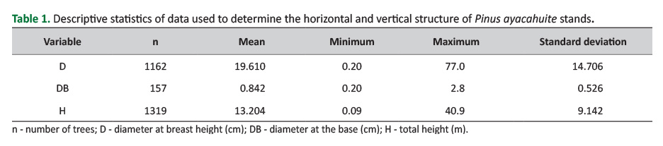 In the Sierra Norte region of Oaxaca, in southern Mexico, studies of diversity and structural composition have been conducted to characterize mixed forest stands and Pinus patula Schltdl. et Cham. (Castellanos et al. 2008, Castellanos-Bolaños et al. 2010, Vásquez-Cortez et al. 2018, Martin et al. 2021). However, it is important to understand quantitative aspects of the dynamics of other species that hold economic, ecological, and social value within forest management. The aim of this study was to determine the horizontal and vertical structure of Pinus ayacahuite Ehrenb. ex Schltdl. stands, considering the diameter and height of the individuals as analysis variables.
