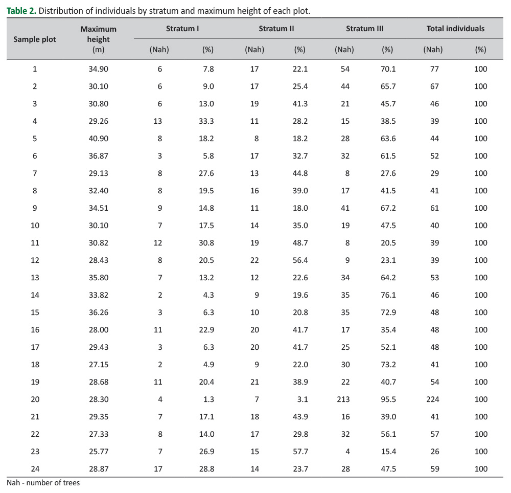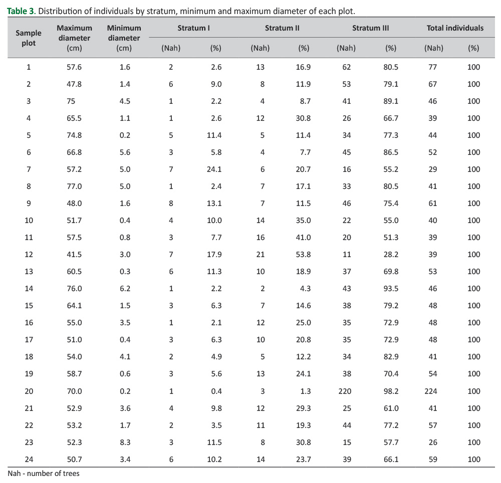 Table 3. Distribution of individuals by stratum, minimum and maximum diameter of each plot.