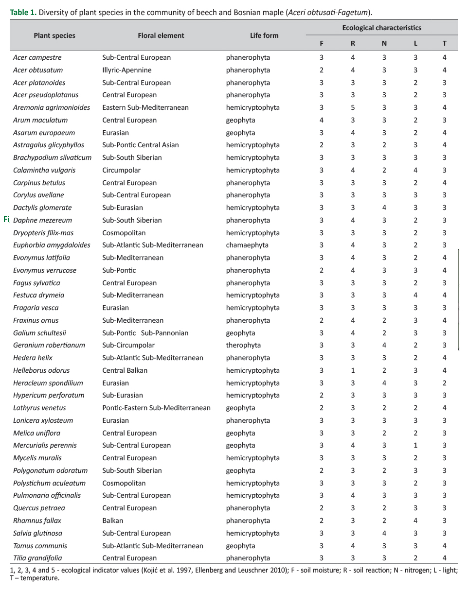 Floristic characteristics of the studied community of beech and Bosnian maple have been determined based on five relevés (30 x 30 m) taken according to the Braun-Blanquet method (Braun-Blanquet 1964). Determination of species was carried out based on the "Flora of the Socialist Republic of Serbia" (Josifović 1970-1977, Sarić 1992). Spectra of floral elements were determined according to Gajić (1980), spectra of life forms according to the method by Kojić et al. (1997), and ecological characterization of plant species according to Kojić et al. (1997) and Ellenberg and Leuschner (2010).
