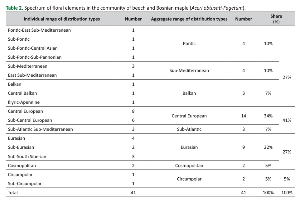 The community of beech and Bosnian maple on Manjača Mt. is characterized by equal shares of Central European and Sub-Atlantic distribution types (41%). The same applies to the community on Jadovnik Mt. On the other hand, the presence of xerophilic plants is much more pronounced in the community found in the investigated area (27%). In comparison with the community described by Fukarek et al. (1967), the community on Manjača Mt. has a pronounced mesophilic character, which can be partly explained by its floristic-geographic position. If the same results are compared with those for the community on Čemernica Mt. (Brujić 2013), the high share of xerophilic plants can be observed, as a result of poorer edafic conditions in the area.