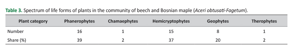 Based on the analysis of life forms, it can be determined that, in community of beech and Bosnian maple, phanerophytes are dominant with 39% (Table 3). Hemicryptophytes are represented by 37%. They are adapted to living conditions in temperate and colder regions and as such represent percentagewise the most numerous group of life forms in the region (Diklić 1984). Significant participation of geophytes indicates relative mesophilic nature of the habitat. From the group of chamaephytes, 2% of plants are identified, the same as annual species of therophytes. In terms of the spectrum of life forms, the community has phanerophytic-hemicryptophytic character.