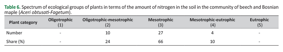 By analyzing values of the ecological index for soil moisture, it can be concluded that in the community of beech and Bosnian maple, submesophytes are predominant with 76% (Table 4). Mesophilic plants are represented by 2%, while there are 22% of subxerophilic plants, indicating the xeromesophilic character of this community.