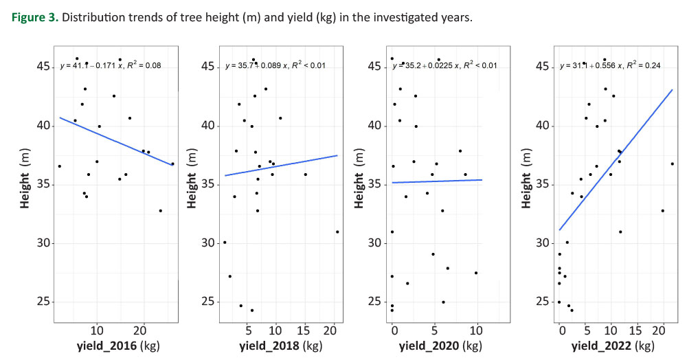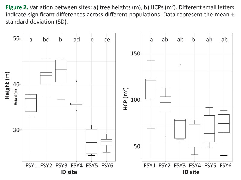 The one-factor repeated measures analysis of variance (ANOVA) was used to assess variations in tree height and HCP between sites, and Tukey’s HSD post-hoc test was used for finding the differences. Linear regressions were calculated to evaluate the influence of tree height and HCP on seed yield. Distributions were tested for normality by Shapiro-Wilkinson test and the relationships between variables were evaluated using Spearman’s correlation coefficient. The level of statistical significance was set at p<0.05.