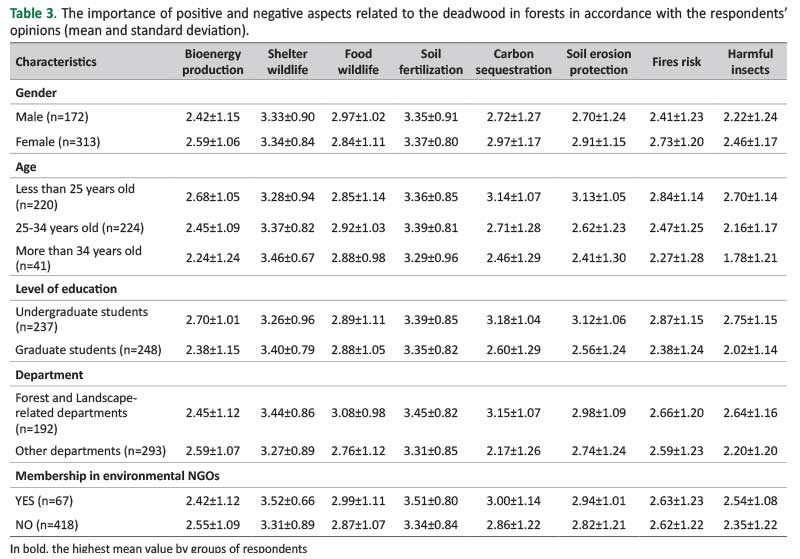 Table 3. The importance of positive and negative aspects related to the deadwood in forests in accordance with the respondents’ opinions (mean and standard deviation).