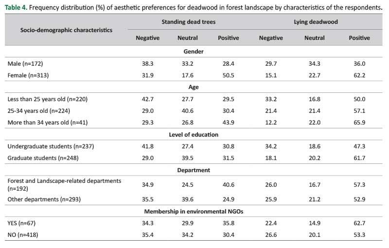 Table 4. Frequency distribution (%) of aesthetic preferences for deadwood in forest landscape by characteristics of the respondents.