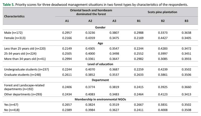 Table 5. Priority scores for three deadwood management situations in two forest types by characteristics of the respondents.