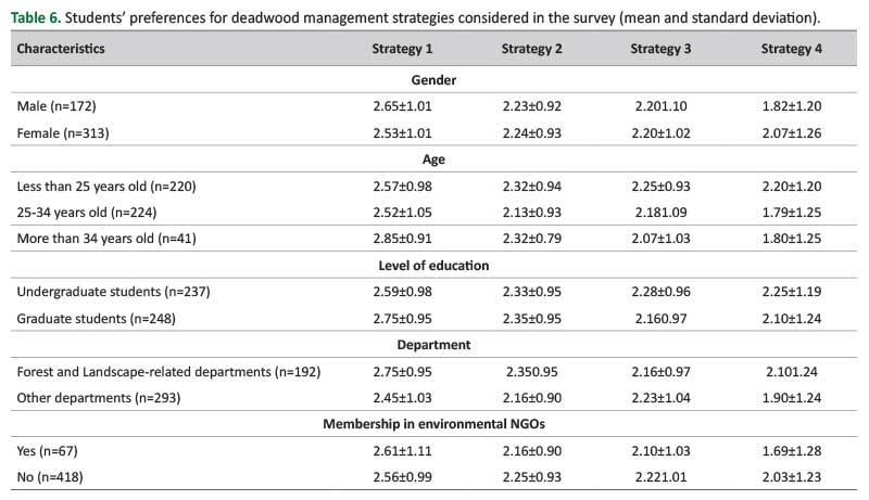 Table 6. Students’ preferences for deadwood management strategies considered in the survey (mean and standard deviation).